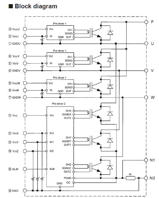 6MBP30RTB060-12 absolute maximum ratings: (1)DC bus voltage: 450 V; (2)DC bus voltage (Surge): 500 V; (3)DC bus voltage (Short operating): 400 V; (4)Collector-Emitter voltage: 600 V; (5)Collector power dissipation One transistor: 85 W; (6)Junction temperature: 150℃; (7)Input voltage of power supply for pre-driver: -0.3 to 20 V; (8)Input signal voltage: Vz; (9)Input singal current: 1 mA; (10)Alarm signal voltage: VCC; (11)Alarm signal current: 15 mA; (12)Storage temperature: -40 to 125℃; (13)Operating case temperature: -20 to 100℃.